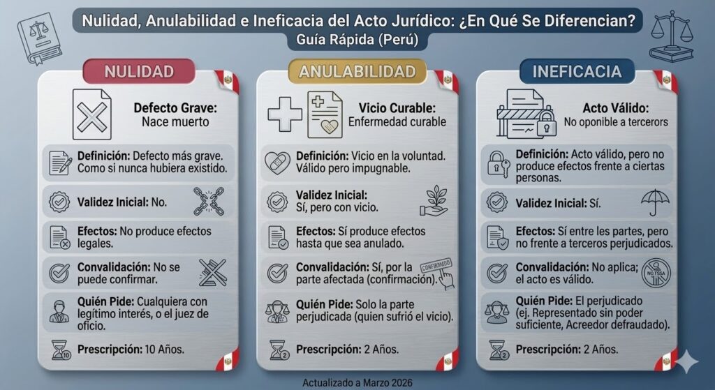 Si alguna vez te has preguntado cuándo un contrato o acuerdo legal realmente tiene valor y cuándo puede ser cuestionado, este artículo es para ti. Voy a explicarte —en lenguaje claro y con base en la ley peruana— tres conceptos que suelen confundirse mucho: la nulidad, la anulabilidad y la ineficacia del acto jurídico. Entender la diferencia puede ser clave para proteger tus derechos.